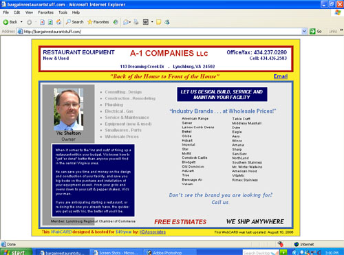 HOW TO GET STARTED: After payment is arranged for your WebCARD, decide what information you wish to include and email me. Include pictures (up to 2) if desired. Within 24 hours I'll have your WebCARD online. Once you view it, you will have one opportunity to make changes in the overall design and copy---at NO CHARGE. After that, any changes for any reason will be billed at $20/hour (minimum charge - $15). As long as you keep your WebCARD, your annual price of $49, will never increase. Anytime you choose to upgrade to a regular website, $49 will be deducted off the prevailing price. Web names must also be renewed annually ($20). READY? CLICK HERE.